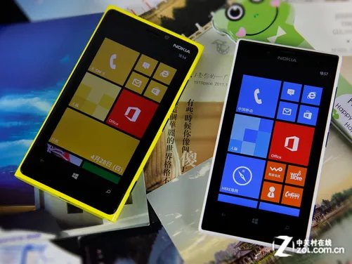 诺基亚920(左)和诺基亚720 诺基亚720的外观与诺基亚920并不太相像,反而更加类似于诺基亚820多一些,不过诺基亚720也采用和诺基亚920同样的一体式机身设计。整体来看,诺基亚720机身尺寸比诺基亚920稍小,更薄、更轻便(诺基亚720:127*67.5*9毫米,重约128克;诺基亚920:130.3*70.8*10.7毫米,重约185克),具备黑、白、红、黄、蓝等五种颜色供用户选择,圆润的造型能够提供更为舒适的手感。